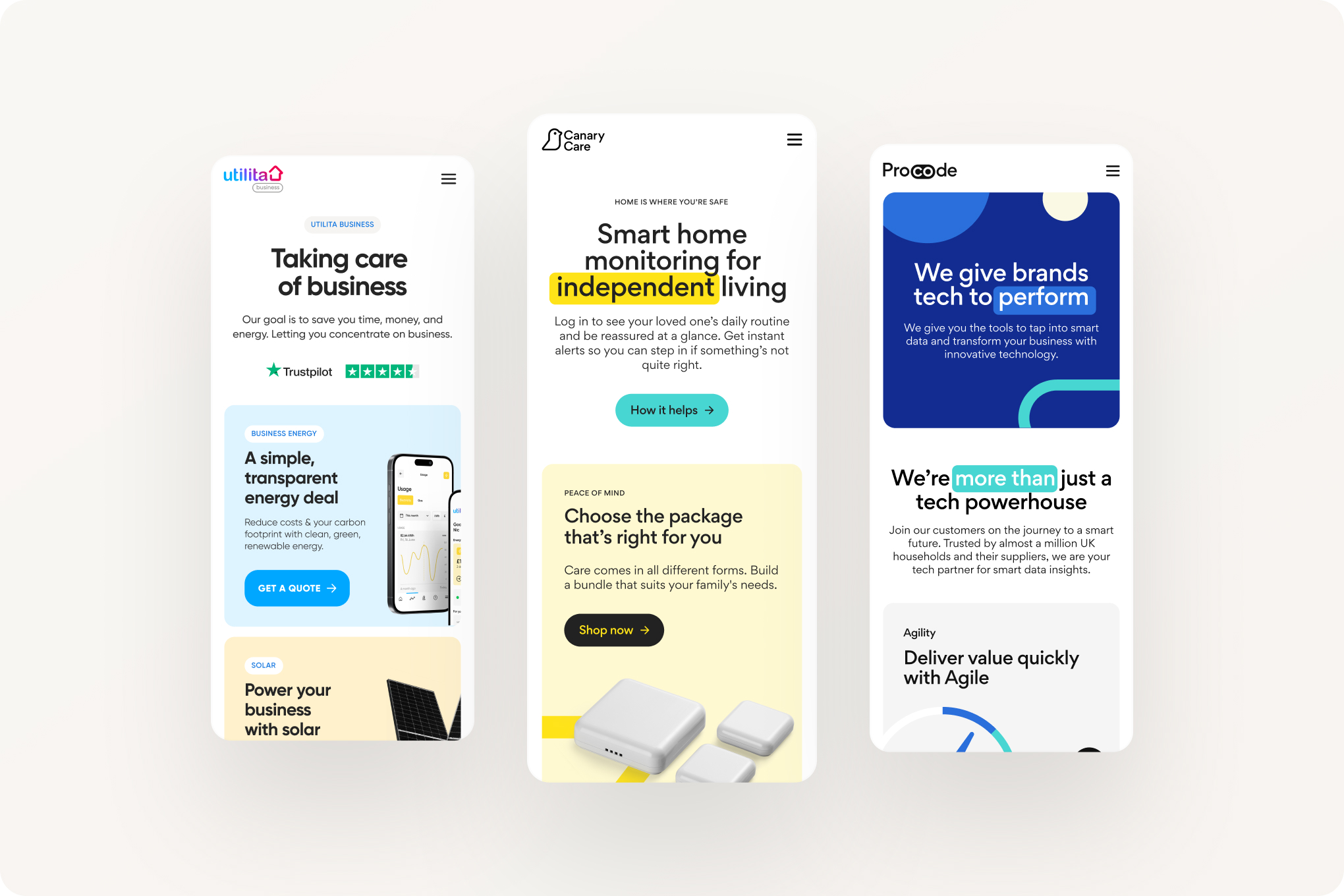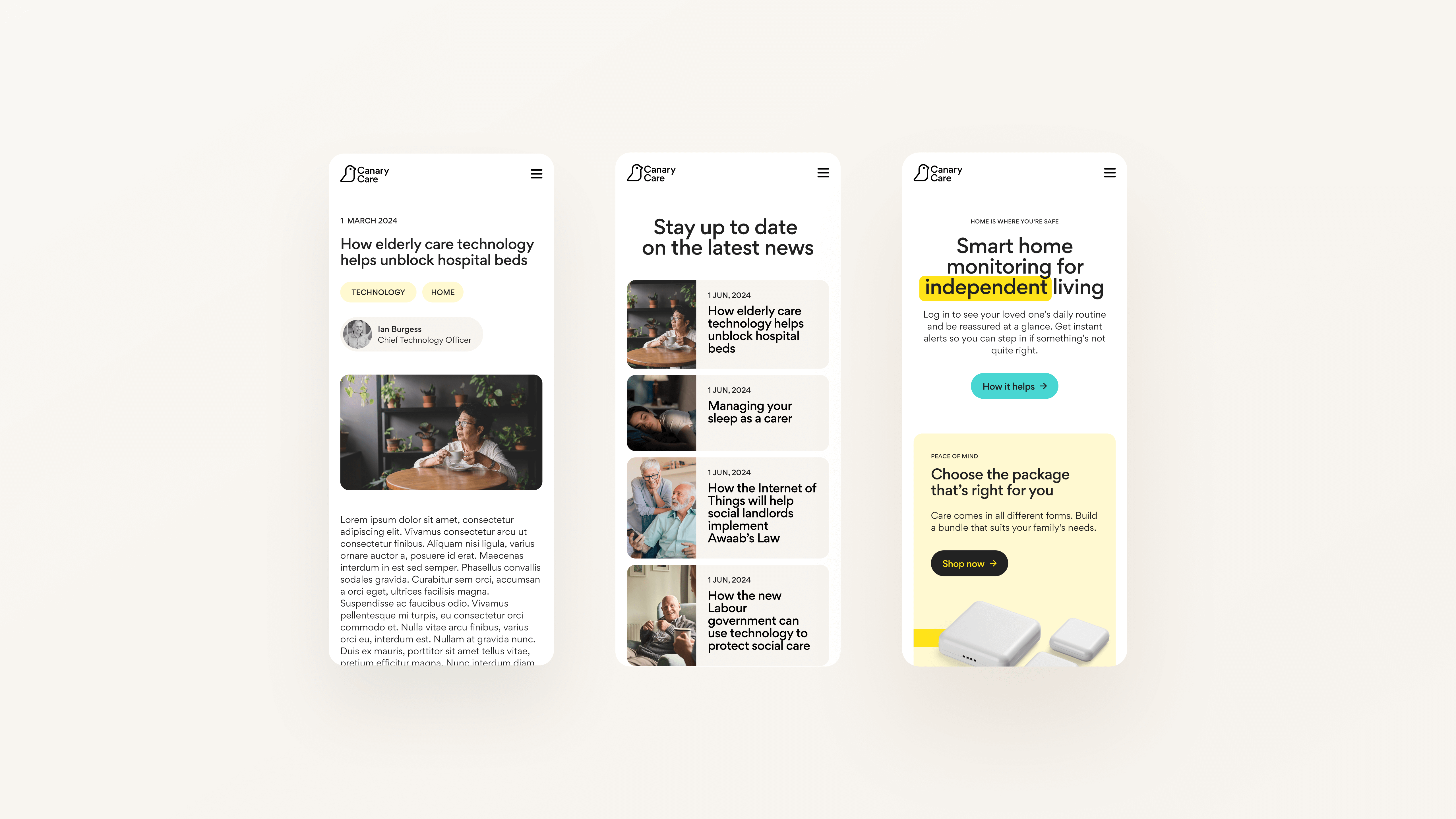 Canary Care provides smart home monitoring solutions that support independent living for vulnerable people. Marketed directly to consumers and professionals in local authorities, NHS organisations and care providers, they needed a digital experience that would present an approachable experience to all of their customers, clearly communicating the benefits of their solutions.