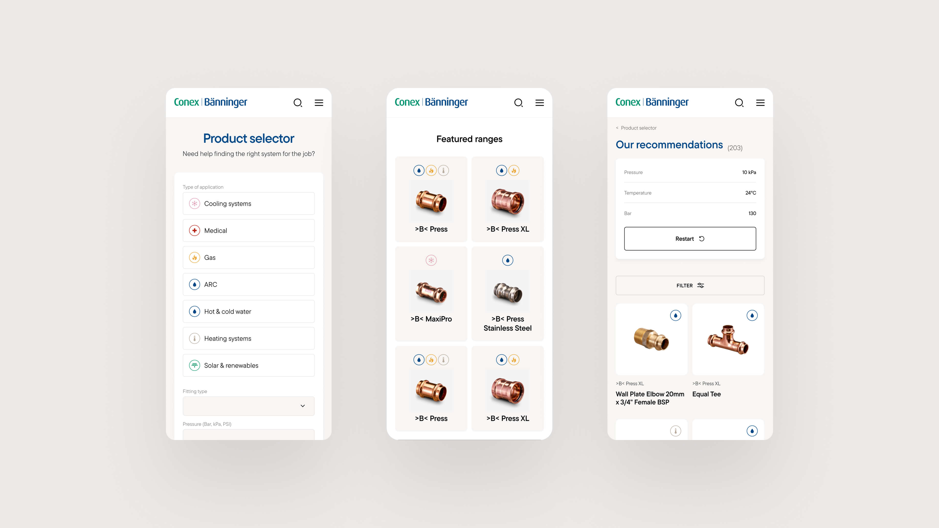 Conex Bänninger customers encompasses industry professionals, installers and distributors across a range of sectors, with differing levels of expertise. Not every user who lands on the site will know exactly what they’re looking for. We built a product selector which would enable the user to select the application, then set pressure, temperature and fitting type in order to suggest the right product for their project without them having to have in-depth knowledge of the range.