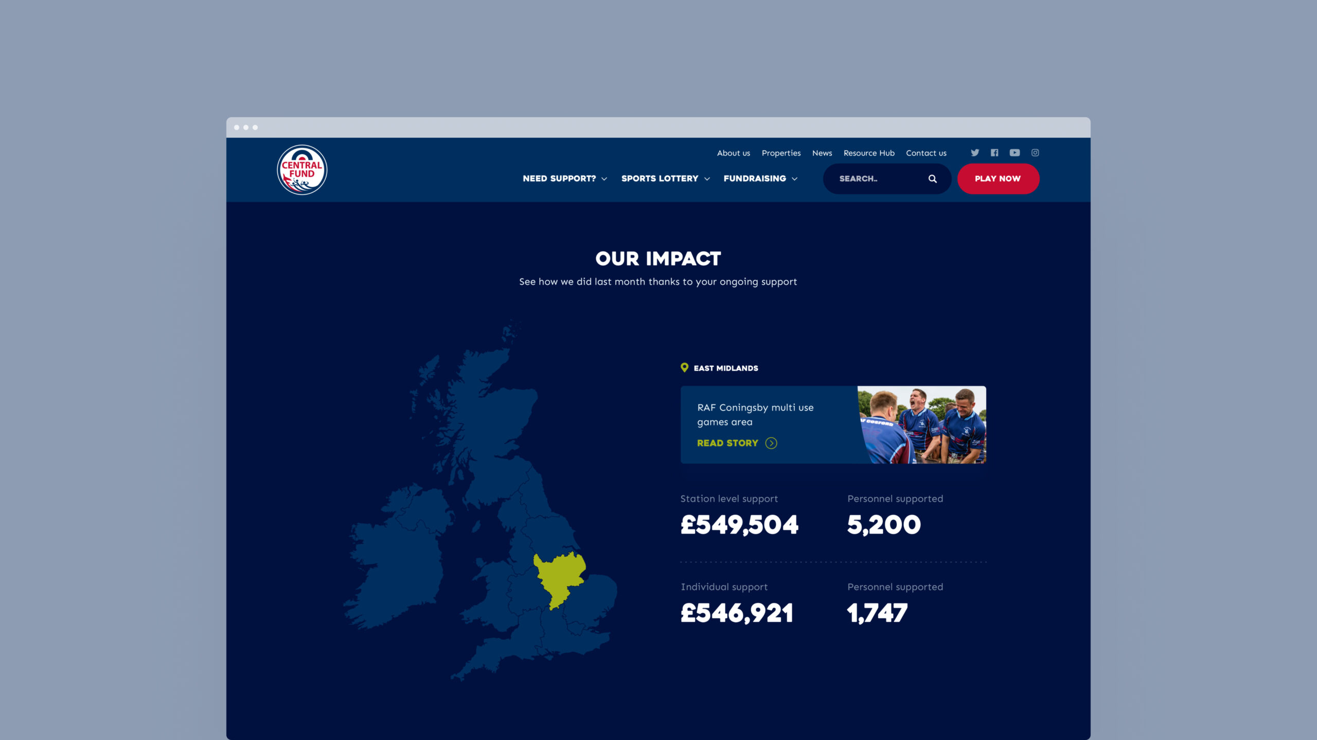The charity wanted an easy way to show where grants had been distrubuted across the country. To do this we built an interactive fundraising map that broke down the funding by region. The regions then linked to stories around how the grants were used to help personnel.